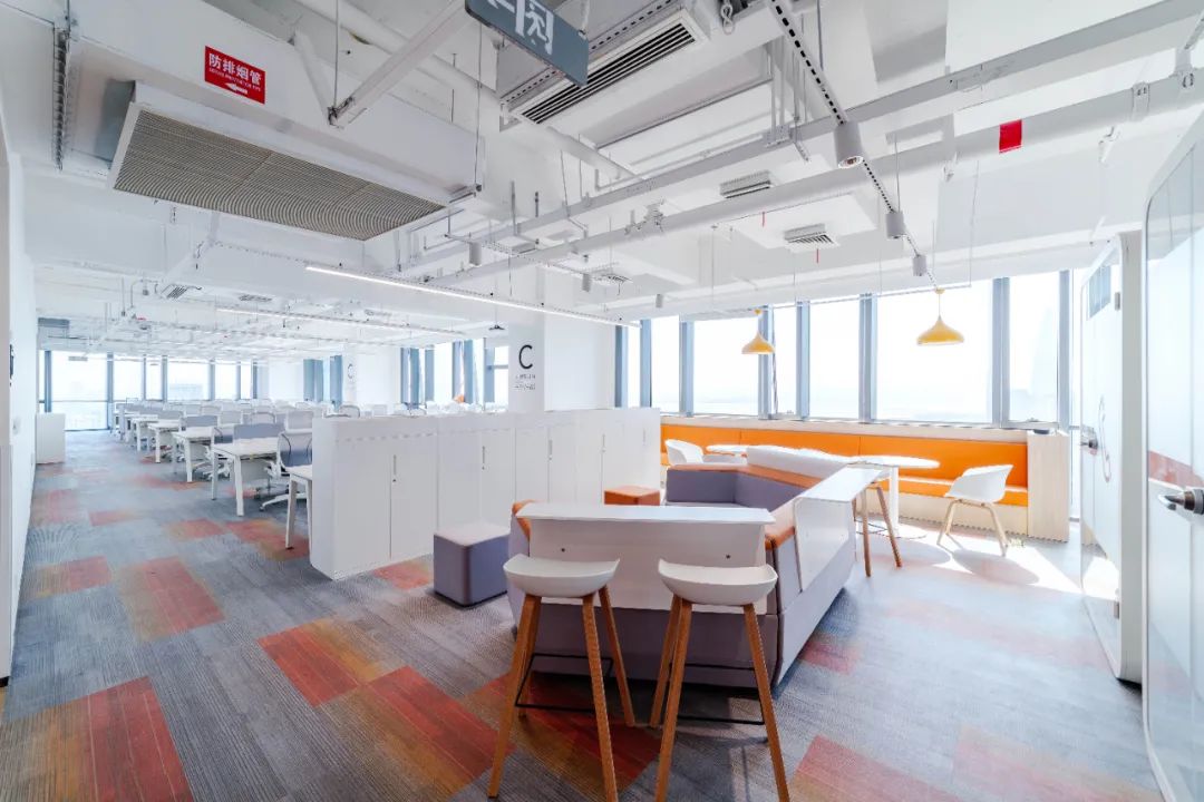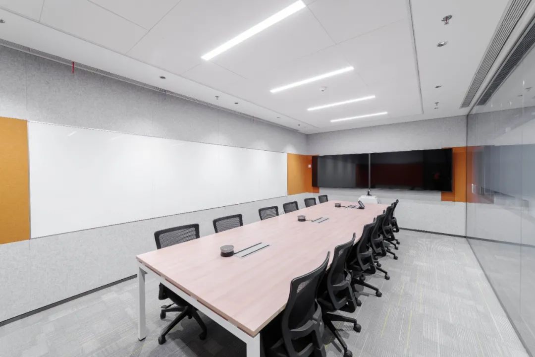 天花采用鋁方通格柵吊頂和開放式原頂噴涂,增加了平面導向性,提升了天花空間,降低了多種裝飾材料堆積造成的空氣污染,營造綠色環(huán)保的辦公環(huán)境。