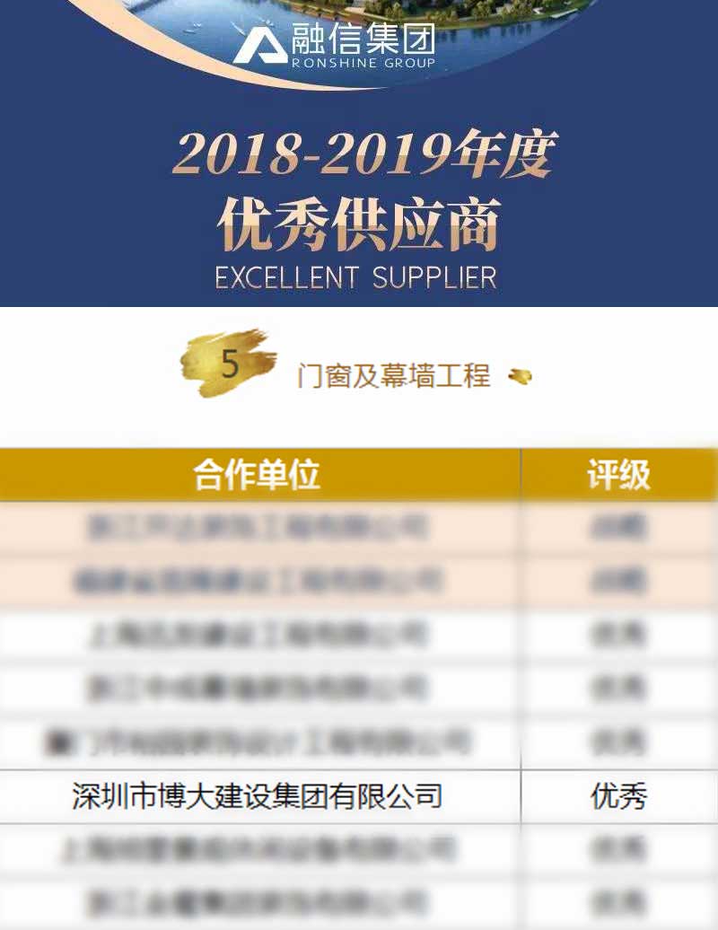 博大建設集團在2018-2019年度成績突出,榮獲融信集團頒發的門窗及幕墻工程“優秀供應商”稱號。融信集團創立于2003年,總部位于上海,是中國房企20強。
